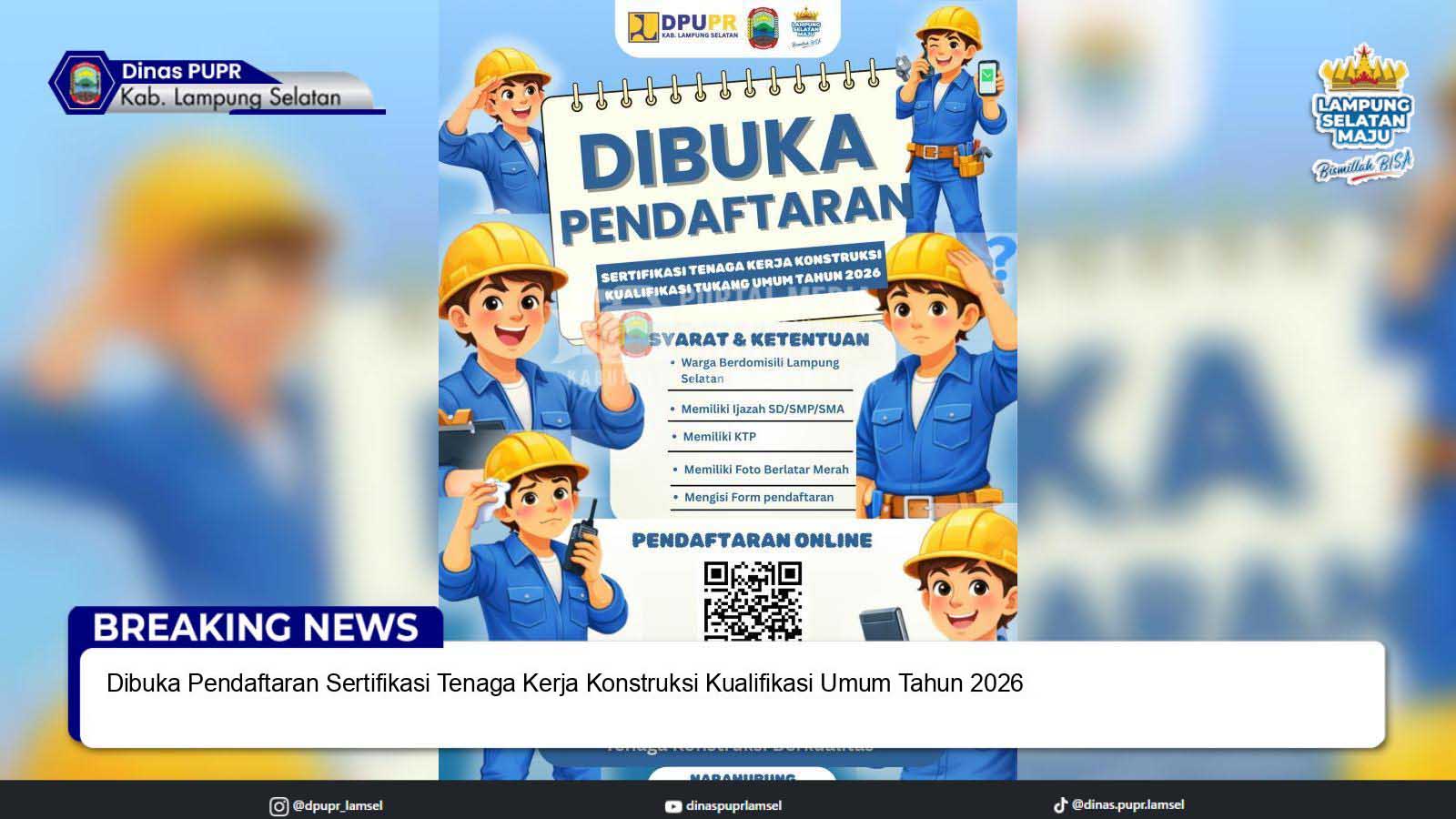 Melalui Dinas Pekerjaan Umum dan Penataan Ruang Kabupaten Lampung Selatan, dibuka Pendaftaran Sertifikasi Tenaga Kerja Konstruksi Kualifikasi Tukang Umum Tahun 2026.